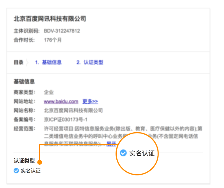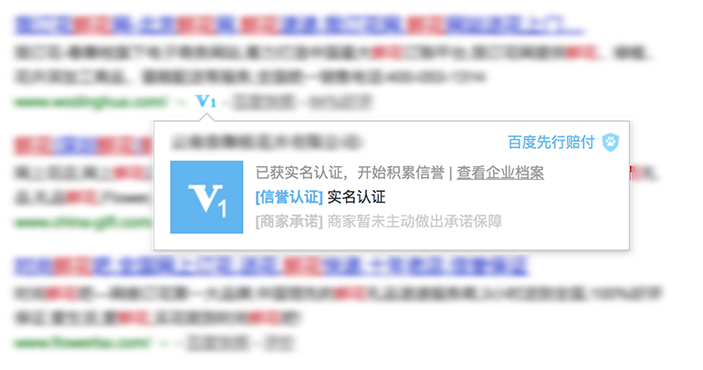 认证成功的企业将获得百度商家信誉评级,拥有量身定制信誉档案,并在百度搜索结果展示蓝色V标。